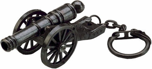 An accurate model of a cannon mounted on a wheeled chassis attached to a key chain.
